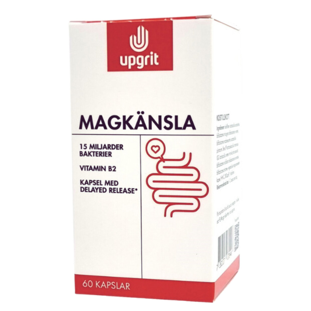 Upgrit Magkänsla är ett noga utvecklat kosttillskott som innehåller minst 15 miljarder mjölksyrabakterier från 10 olika bakteriestammar. Produkten innehåller bland annat stammen L rhamnosus GG som är mycket välstuderad. Magkänsla innehåller dessutom vitamin B2 vitamin som hjälper till att bibehålla normala slemhinnor i kroppen. - Patenterad kapsel